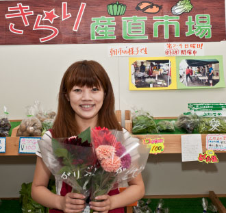 県外の方から「紅大豆を送って欲しい」と問い合わせがあった事がきっかけになって、インターネットショップとして2009年12月7日に開設した「きらり産直市場」。農作物や生花、手芸品、焼き菓子など地元出品者の方も増え「地産地消」の取り組みとして、ローソン川西吉田店の駐車場で毎月1回朝市を開催していましたが、2011年6月5日にはローソン店内にリニューアルオープン。紅大豆の加工食品や旬の野菜・山菜、手作りの手工芸品、日本一のダリアも販売しています。